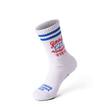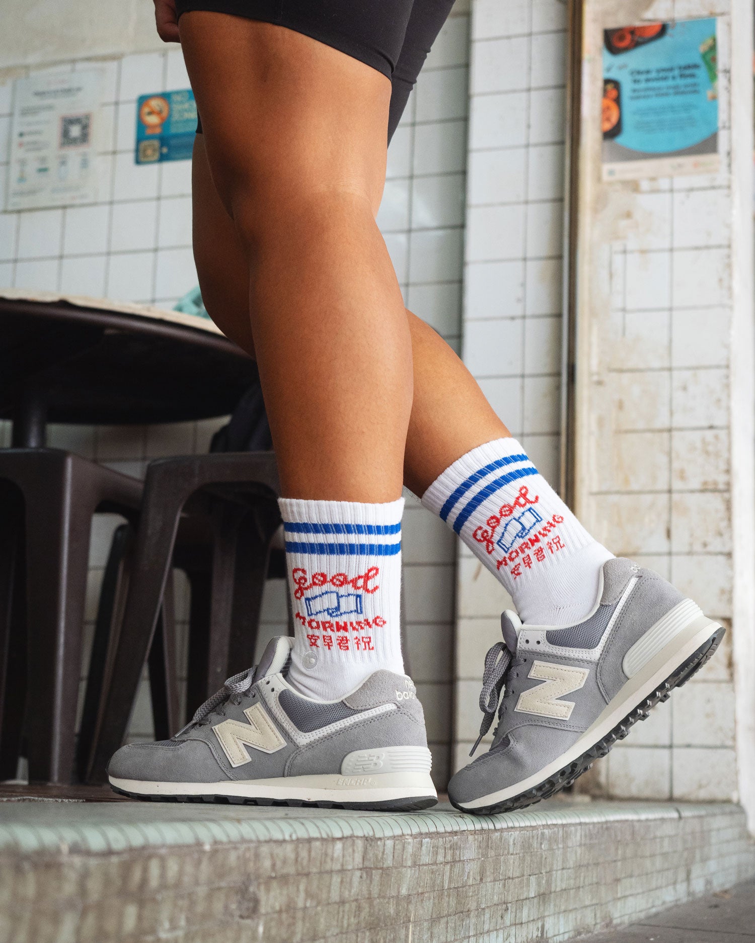 Slipping into a pair of the Good Morning Athletic Sock is like getting a hug made of sunshine. This design is inspired by the iconic white, red and blue tea towels found in traditional coffee shops all over Singapore. The Chinese characters translate as "Have a good morning". Take the Good Morning Athletic sock out for a spin on your next workout, or simply as statement with your outfit.